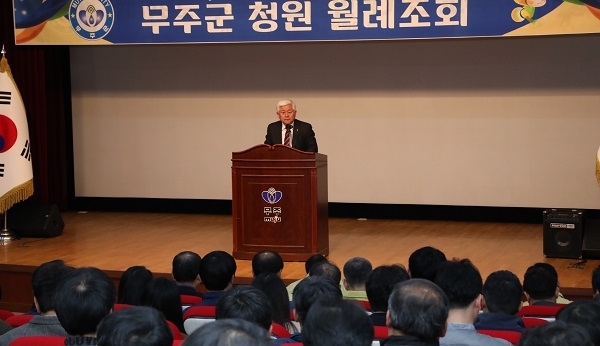 1일 전통문화의 집에서 진행된 직원 월례조회에서 황 군수는 “앙상했던 나뭇가지에 새순이 돋아나고 개나리, 진달래꽃 만발하며 본격적인 농사가 시작되는 봄”이라며 “군정에도 봄기운이 깃들어 무주다운 무주 행복한 군민을 실현하기 위한 구체적인 실천이 이어질 수 있도록 노력해달라”고 당부했다.