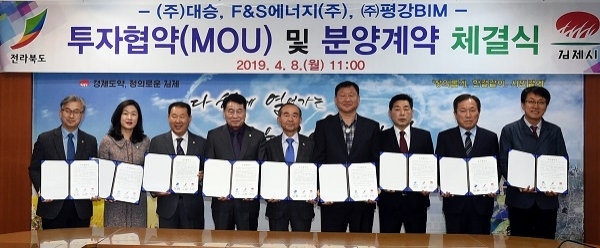 김제시는 ㈜대승, (주)F&S 에너지 및 백구 농공단지에 투자하는 ㈜평강 BIM과 투자협약을 체결했다고 8일 밝혔다.