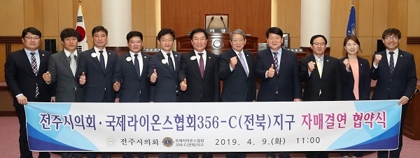 전주시의회와 국제라이온스협회 356-C(전북)지구는 9일 시의회에서 상호간의 우호 증진과 전주지역 발전을 위해 노력하는 등 자매결연 협약을 체결했다.