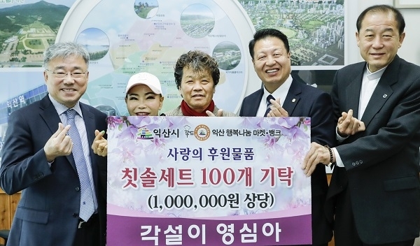 춘하추동예술단의 품바 ‘영심아’는 지난 12일 박철웅 익산 부시장을 방문해 익산행복나눔마켓·뱅크를 이용하는 어려운 이웃들에게 전달해 달라며 칫솔세트 100개(시가 100만원 상당)를 기탁했다.