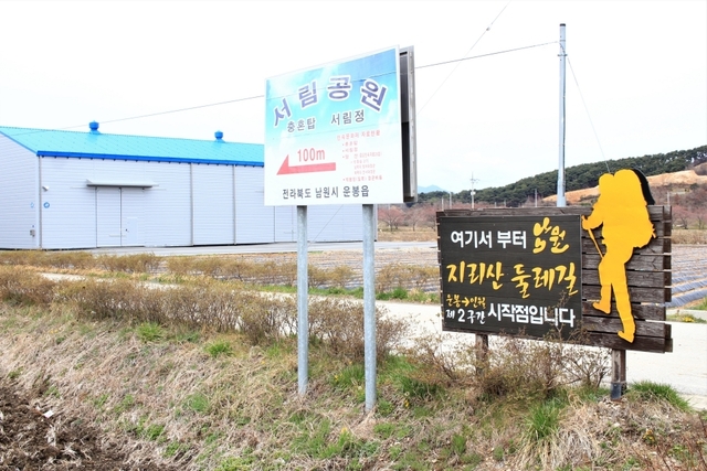 지리산 둘레길 2구간은 운봉(雲峰)읍사무소에서 시작합니다. 읍사무소에서 인월면(引月面) 가는 방향으로 차도를 따라 걸으면 지리산 둘레길 2구간 시작을 알리는 표지판을 볼 수 있습니다. 표지판이 알리는 길로 접어들어 100여 m 가면 서림공원입니다.