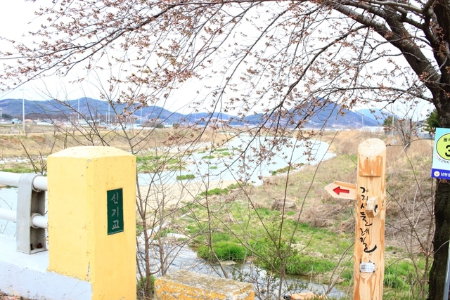 람천을 따라 걷는 길 풍경은 여느 둘레길과 좀 다릅니다. 가까이에는 좌측에는 람천이 흐르고 우측으로는 논과 밭이 펼쳐져 있습니다. 운봉평야를 가로질러 걷는 길입니다. 조금 더 멀리 시선을 던지면 왼쪽은 고남산과 수정봉으로 이어지는 백두대간이 오른쪽에는 바래봉과 고리봉이 바람막이가 되어주고 있습니다. 운봉평야와 지리산 풍경을 바라보며 여유롭게 걷다보면 첫 번째 다리가 나옵니다. 신기교입니다.