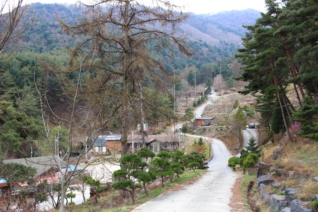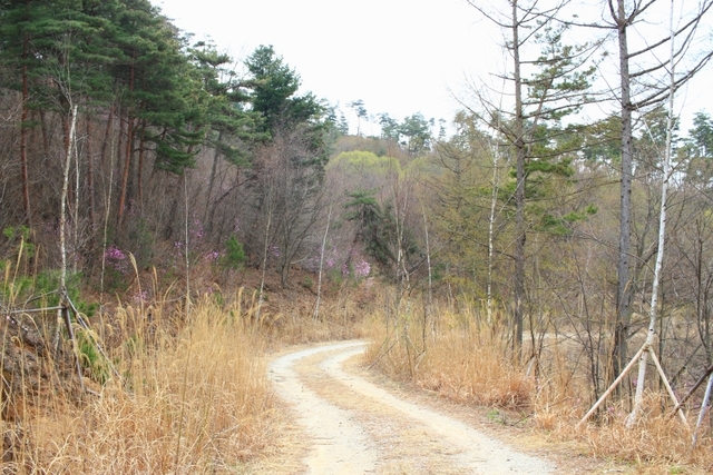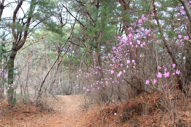 이제 종점으로 향하는 마지막 구간으로 향합니다. 자연휴양림 관리사무소를 지나 도로를 따라 100여 m 내려가면 표지판이 오른쪽 숲길로 안내합니다. 숲에는 마침 진달래가 활짝 피어 봄 분위기가 물씬 납니다. 숲길은 중간에 도로를 만나기도 하지만 마을까지 이어집니다.