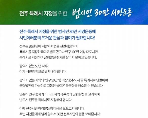 서명운동은 다음달 3일까지 다수의 시민들이 운집하는 전주월드컵경기장, 한옥마을, 영화의 거리 등에서 펼쳐진다.