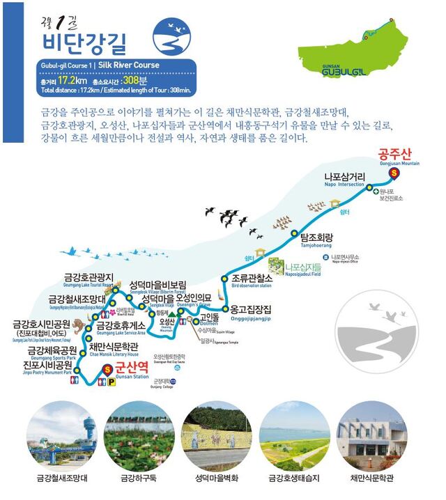 금강이 주인공으로 이야기를 펼쳐가는 길로 채만식 문학관, 금강철새조망대, 금강호관광지, 오성산, 나포십자들로 이어지면서 군산의 전설과 역사, 자연과 생태를 모두 만날 수 있는 길입니다.