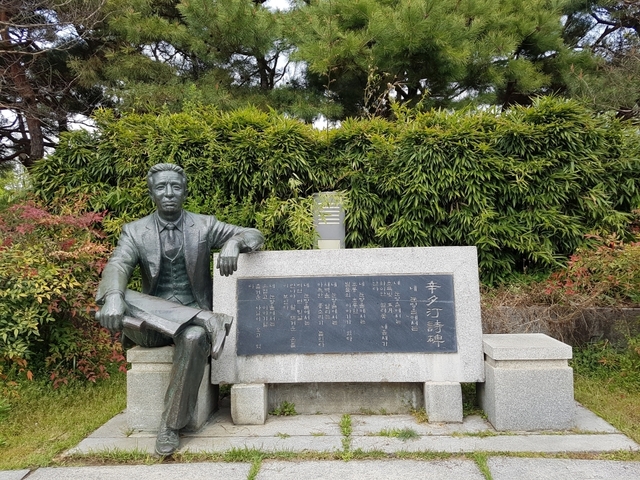녹두 장군으로 유명한 전봉준 동상도 보입니다. 조선 후기 동학 농민 항쟁의 지도자로서, 부패한 관리 규탄 및 시정에 힘쓰셨지요. 이를 기리는 동상은 1981년에 설치됐다고 합니다. 더불어 목가적인 서정시의 대가인 신석정 시인의 시비는 물론,