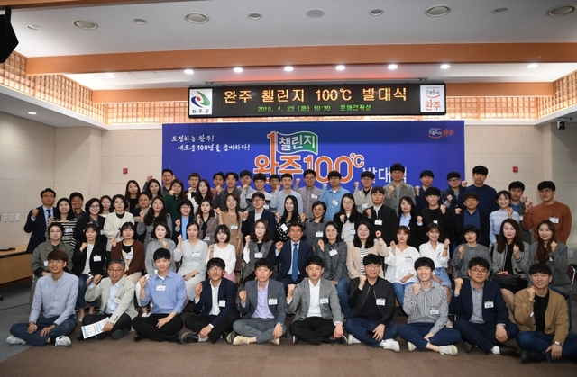 이날 군청 문화강좌실에서 열린 ‘완주 챌린지 100℃’ 발대식에는 임용된 지 5년 이내 신규 공직자 80명과 멘토 역할을 맡은 6~7급 직원, 그리고 박성일 완주군수를 비롯한 간부공무원들이 참석, ‘완주 챌린지 100℃’ 에 대한 기대감을 보였다.