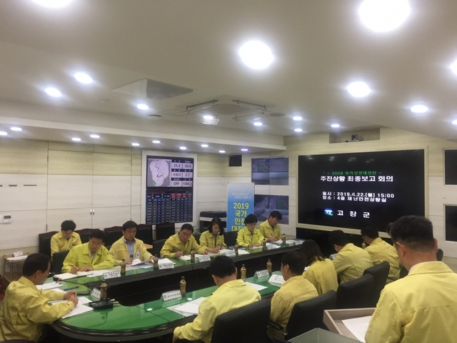 고창군이 61일간 진행된 2019 국가안전대진단 민관합동 안전진단을 성공적으로 마무리하고 지난 22일 군청 재난안전상황실에서 정토진 부군수 주재로 ‘2019 국가안전대진단 추진상황 최종 결과 보고회’를 열었다.