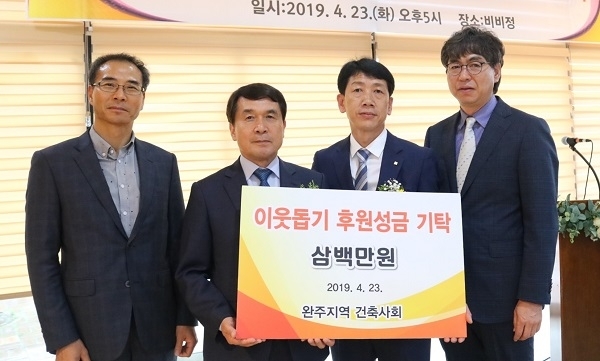 완주 건축사회 제2대 회장으로 지난 23일 취임한 홍영식 씨가 이웃돕기 성금 300만 원을 완주군에 기탁했다.