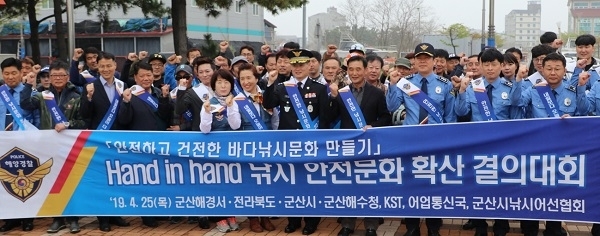 군산해양경찰서(서장 서정원)는 25일 비응항에서 낚시어선 종사자 및 유관기관 관계자 200여 명이 참석한 가운데 안전하고 건전한 낚시문화 조성을 위한 ‘Hand In hand 낚시 안전문화 확산 결의대회’를 가졌다.