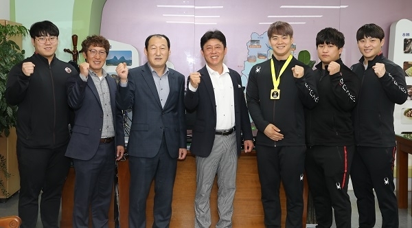 진안군 최성용 군수권한대행이 29일 2019 아시아역도선수권대회에서 금메달 2개를 따고 돌아온 군청 역도팀 유동주 선수를 찾아 격려의 말을 전했다.