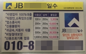 지난 30일 전북은행과 시민들에 따르면 3금융권인 ‘JB○○○○ 일수’라는 업체는 최근 전주시내 곳곳에 일수대출 관련 명함을 뿌렸다.