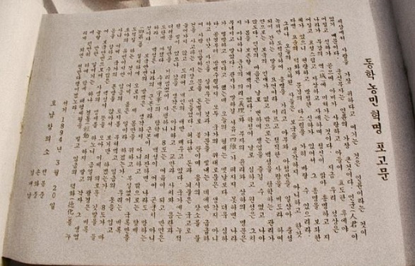 포고문은 “세상에서 사람이 가장 귀하다는 것은 인륜이 있기 때문이다”로 시작해 “의로운 깃발을 들어 보국안민으로써 죽고 살기를 맹세 한다”로 이어진다. 당시 포고문은 고부 농민 봉기 이후 전봉준을 비롯한 동학농민혁명 지도부가 무장에서 재봉기를 선언하면서 발표했다.
