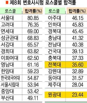 1일 법무부가 공개한 제8회 변호사시험(변시)의 로스쿨별 합격률에 따르면 원광대가 23.44%로 지난해에 이어 가장 낮은 합격률을 기록했다. 전북대는 35.60%로 전국 로스쿨 중 다섯 번째로 낮은 합격률을 기록했다.
