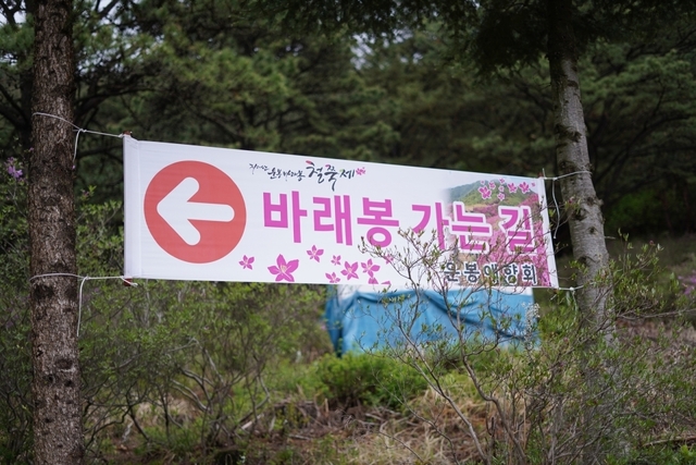 바래봉의 철쭉길의 시작은 ‘자연사랑 철쭉사랑’이라고 새겨진 바래봉 식수대가 표식입니다. 왜냐하면 이 식수대의 바로 옆에 철쭉제의 ‘바래봉 가는 길’이라는 플래카드가 붙어있기 때문입니다. 플래카드를 지나 왼쪽으로 올라가는 길에 철쭉들이 하나씩 보이기 시작합니다.