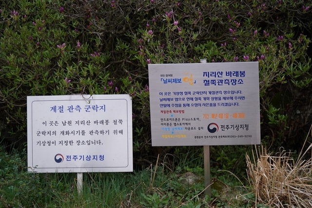 바래봉을 좀 더 위로 올라가면 지리산 바래봉 철쭉관측장소라는 표지판을 볼 수 있는데요. 이곳이 바로 계절관측 군락지인 바래봉 철쭉지의 주요 장소이기도 하니 여행을 가시는 분들은 포토 스팟으로 기억하셔도 됩니다. 물론 주변에 핀 철쭉의 아름다움은 더할 나위 없이 아름답습니다.