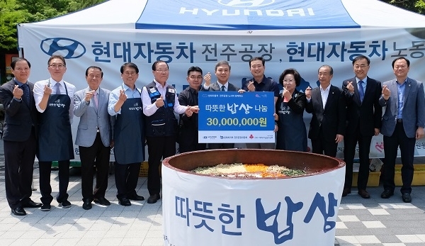 현대자동차 전주공장(공장장 문정훈) 노사가 전북지역 취약계층 어르신들에게 정성껏 차린 따뜻한 밥상을 대접하기 위해 10일 성금 3000만원을 쾌척했다.