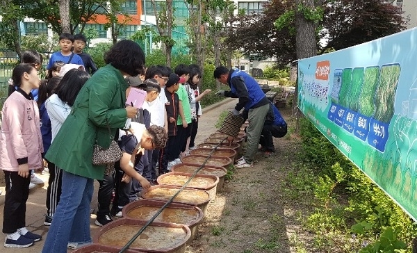 친환경연합회 회원들은 이날 서울지역 학교를 직접 찾아가 고무화분을 이용해 상토를 넣고 학생들이 직접 모를 심어보는 체험 프로그램을 진행했다.