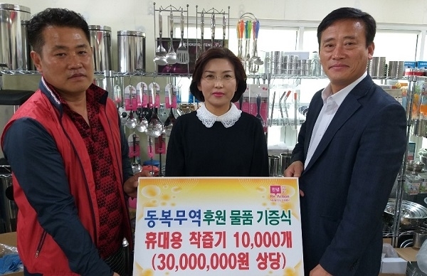 이날 기증받은 물품은 일상생활에서 손쉽게 사용할 수 있는 휴대용 착즙기(물통 대용) 1만개다. 시가 3000만원 상당의 이 착즙기들은 자원봉사센터 홍보물품으로 사용될 예정이다.