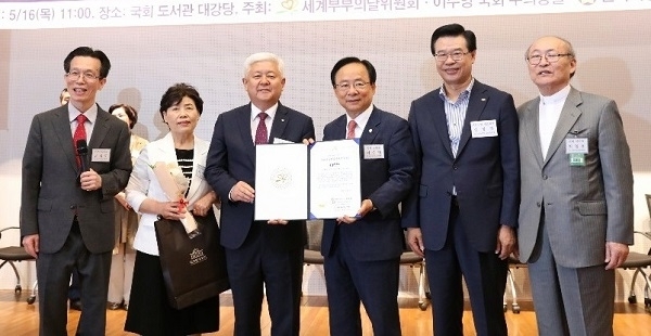 16일 국회 도서관에서 열린 2019 세계 부부의 날 국회기념식에서다. 이날 행사는 이주영 국회 부의장, 세계 부부의 날 위원회, 전국 시장군수구청장협의회가 공동 주최한 것으로, 전국의 시장·군수·구청장 부부 중 남다른 부부애로 지역에 귀감이 되는 부부를 발굴해 시상했다.