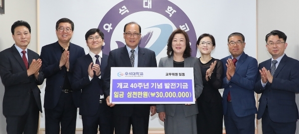 지난 16일 우석대 교무위원들은 개교 40주년을 맞아 대학 발전의 염원을 담아 기금 3000만 원을 출연해 장영달 총장에게 전달했다.