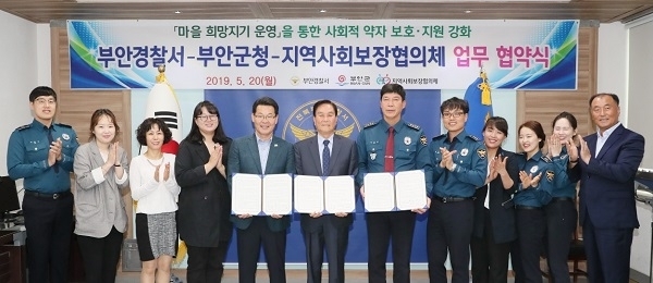 부안경찰서(서장 임성재)는 20일 경찰서 2층 회의실에서 경찰서장, 부안군수, 지역사회보장협의체 위원장 등이 참석해 사회적약자 보호·지원 강화를 위해 마을 희망지기 활성화 추진 관련 업무협약을 체결했다.