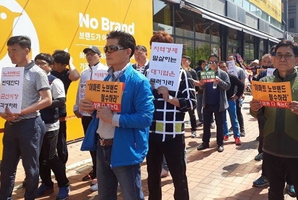 이마트 자체 브랜드 상품 판매장인 노브랜드(No brand) 군산 1호점이 문을 열자, 지역 상인들이 개점철회를 요구하며 반발했다.