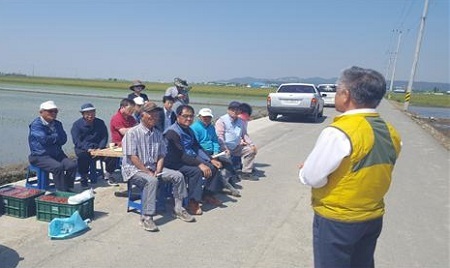 김병래 군산시농업기술센터 소장은 최근 드론을 이용한 군산시 옥구읍 수산리 벼 직파현장을 방문해 현장에서 겪는 농업인들의 애로사항을 청취했다.
