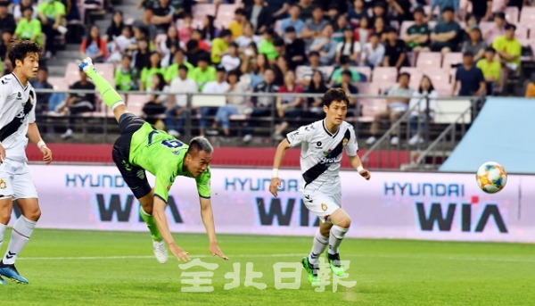 전북현대모터스와 경남FC의 '하나원큐 K리그 2019' 13라운드 경기가 열린 26일 전주월드컵경기장에서 전반 22분경 김신욱 선수가 강력한 헤딩슛 공격을 하고 있다.