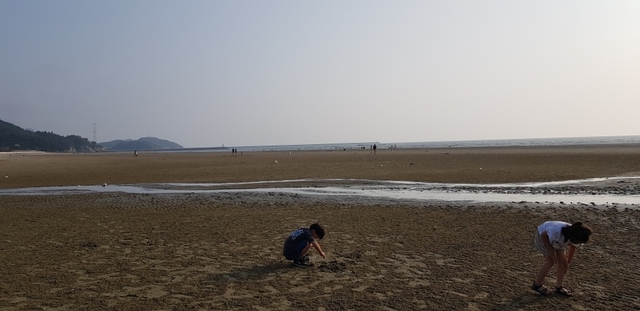 특히 바닷물이 빠지면 백사장이 단단해져서 축구를 할 수 있을 정도이고 나지막한 야산으로 둘러싸여 있어 아늑합니다. 갯벌 한 점 없이 고운 백사장이 돋보이는 곳이죠.