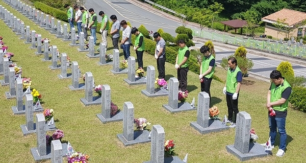 임직원 30여명이 참여한 이날 활동은 태극기 꽃기 체험과 함께 호국영령들을 경배하는 묘역 가꾸기 행사도 병행했다.