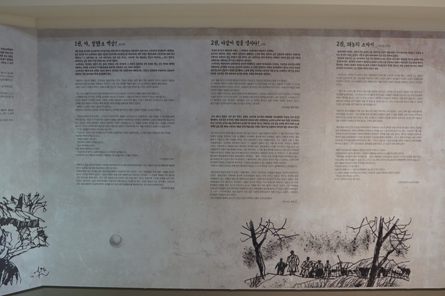 아리랑문학마을은 홍보관, 하얼빈역, 내촌. 외리 마을, 근대 수탈 기관으로 구성되어 있습니다. 홍보관 1층은 벽면을 소설 <아리랑> 에 대한 텍스트로 꾸며 놓았습니다. 12권짜리 대하소설 대강의 줄거리를 한눈에 볼 수 있어 책을 미처 보지 못한 이에게 친절한 안내서가 되는 공간입니다. 아리랑>