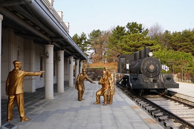 넓은 야외의 또 다른 공간으로 아리랑 문학마을의 하얼빈역은 안중근 의사의 하얼빈 의거 장면을 실감 나게 볼 수 있습니다. 당시 이토 히로부미가 열차에서 내린 후 안중근 의사가 당긴 방아쇠에 의해 총격을 받는 역사적 장면을 생생하게 볼 수 있습니다.
