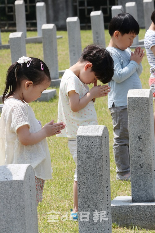 현충일을 하루 앞둔 5일 전주 군경묘지를 찾은 어린이들이 순국선열의 희생정신을 추모하며 묵념하고 있다.