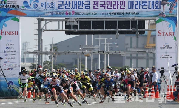 9일 군산시 새만금 방조제에서 열린 제5회 군산 새만금 전국인라인 마라톤대회에서 스타트라인을 출발한 참가 선수들이 힘차게 질주하고 있다.