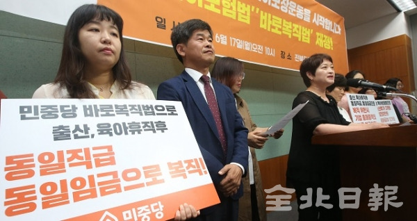 17일 민중당 전북도당이 전북도의회 브리핑룸에서 기자회견을 열고 ‘육아보험법’과 ‘바로복직법’ 제정을 촉구하고 있다.