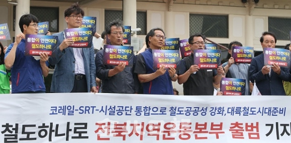 18일 전주역광장에서 전북민중행동 철도하나로운동본부 관계자들이 출범 기자회견을 열고 코레일-SRT-철도시설공단 통합으로 철도공공성 강화하고 통일 이후 대륙철도시대를 준비해야 한다고 주장하고 있다.