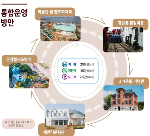 금강권 통합운영의 방법은 박물관 벨트화 지역을 출발해 경암동 철길마을, 3.1운동 기념관, 채만식 문학관, 금강 철새조망대까지의 선순환 관람을 하는 방식이다.