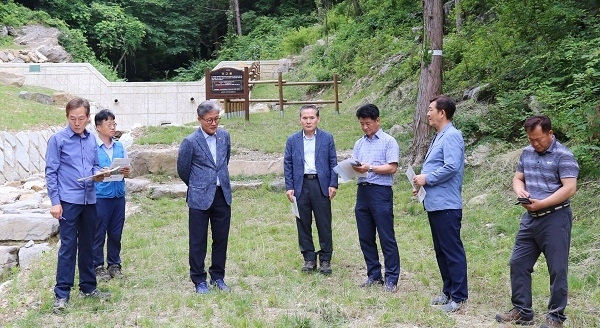 김재현 산림청장이 지난 4일 무주군을 방문, 무주국유림관리소 채진영 소장으로부터 현안업무 보고를 받고 무주 관내 사방댐사업장과 설천면 삼공리 리기다소나무숲 등을 찾아 현장 중심의 소통 행보를 펼쳤다.