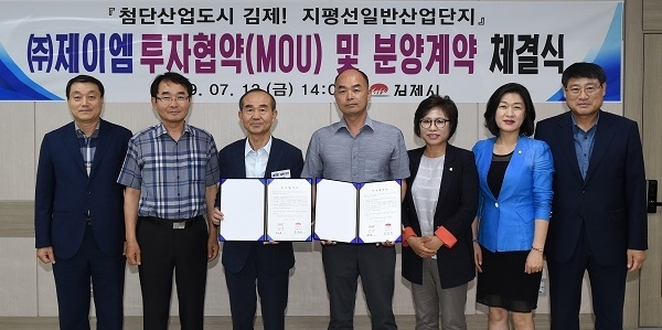김제시(시장 박준배)는 지난 12일 ㈜제이엠이 지평선산업단지에 투자협약 및 분양계약을 체결하고 총 47억 투자 및 32명의 고용을 창출한다고 밝혔다.