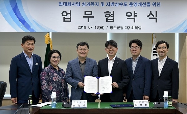 장수군이 K-water와 16일 지방상수도 운영효율화를 위한 업무협약을 체결했다.