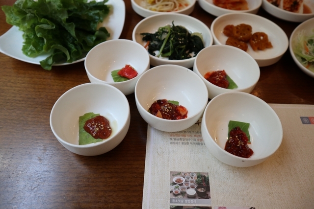 곰소젓갈은 5가지 종류가 나오는데요. 지방분해효소가 있어서 소화가 잘되고 노화방지와 항암 효과 등 성인병 예방에 좋다고 하는데요. 곰소젓갈이 쌈과 함께 나오는 이유는 쌈 채소와 고기를 쌈장 대신 젓갈과 함께 먹으면 맛이 더욱 좋기 때문이라고 합니다.
