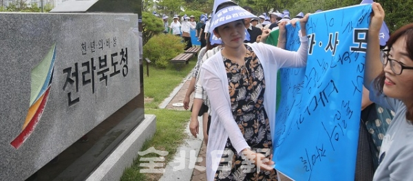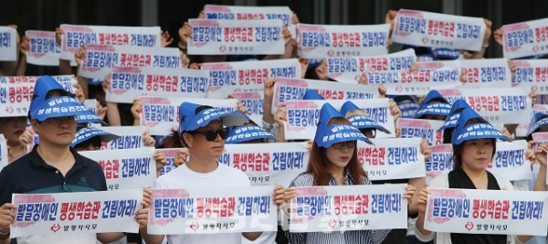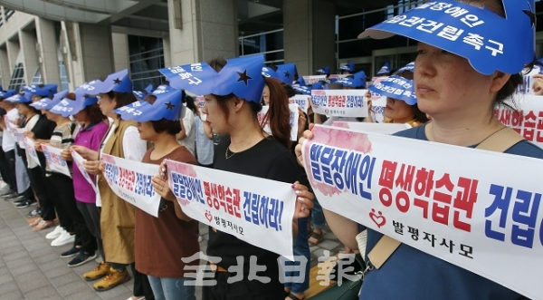 18일 발달장애인의 평생교육과 자립을 응원하는 사람들의 모임 회원들이 전북도청 앞에서 기자회견을 열고 발달장애인을 위한 평생학습관 건립을 요구하고 있다.