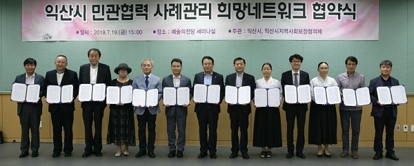 익산시는 지난 19일 익산예술의전당에서 성공적인 민관협력 사례관리 희망네트워크사업 추진을 위해 지역 13개 공공기관·사회복지관 등과 업무협약을 체결했다.
