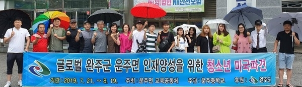 완주군 운주면 교육공동체(대표 서정식)가 글로벌 인재양성을 위해 청소년 미국연수 프로그램을 진행하고 있다. 운주면 교육공동체에 따르면 지난 20일부터 내달 19일까지 관내 7명(김재연 외 6명, 운주중)을 지원해 미국 문화체험과 교류활동을 이어가고 있다.
