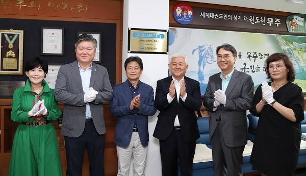 무주군이 25일 황인홍 군수와 이광환 군의회 부의장, 세계맑은공기연맹 김윤신 대표 등 10여 명과 함께‘Good Air City(이하 맑은 공기 모범도시)’ 현판식을 가졌다.