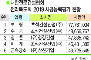 2019년도 전북지역 전문건설업체 시공능력평가액 초석건설산업 1위