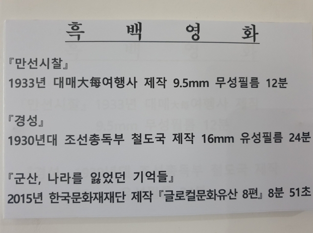 관련 영상물로 [만선시찰]1933년 대매여행사 제작9.5mm 무성필름, [경성]1930년대 조선총독부 철도국제작 16mm 유성필름, [군산, 나라를 잃었던 기억들] 2015년 한국문화재단 제작 ‘글로컬문화유산8편’ 등이 상영되고 있습니다.