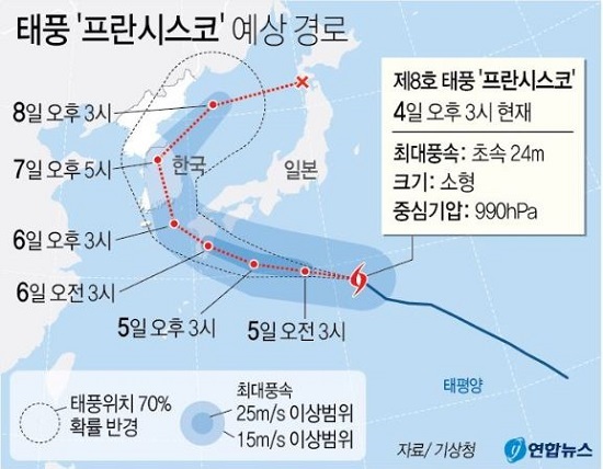 프란시스코는 5일 오전 9시 가고시마 동남동쪽 약 560㎞ 해상, 6일 오전 9시 가고시마 북서쪽 약 140㎞ 해상으로 이동한 뒤 6일 밤 남해안에 상륙할 것으로 보인다.