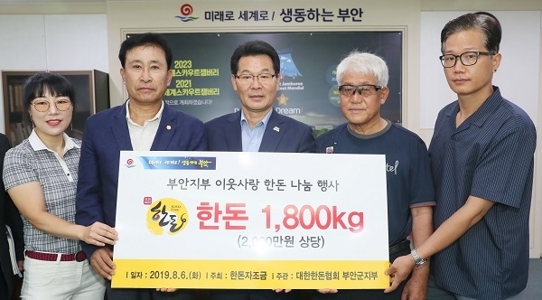 대한한돈협회 부안지부(지부장 최진광)는 6일 부안군을 방문해 관내 소외되고 어려운 이웃과 군민의 안전을 위해 애쓰고 있는 군부대, 경찰서, 소방서 등에 전달해 달라며 한돈(국산돼지) 1800kg(약 2천만원 상당)을 기탁했다.이번 한돈 나눔 행사에는 권익현 군수와 최진광 한돈협회 부안지부장 등이 참석한 가운데 기탁식을 진행했다.또한 당일 읍면사무소와 각 기관으로 전달되어 부안군내 어려운 이웃과 저소득층에게 지원됐다.